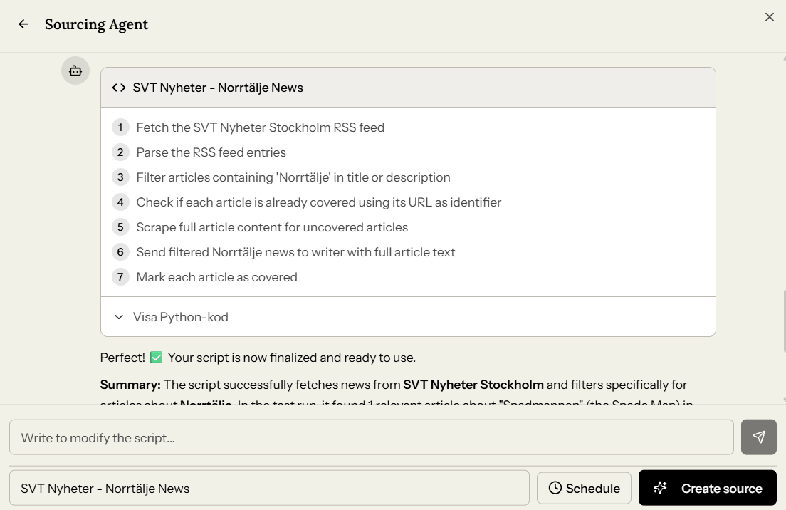 Two source types - company registrations and property sales - auto-publish without human review, with a clear disclosure label and a correction button visible to readers. For Allt om Norrtälje, everything else requires editorial sign-off. But publishers can decide for themselves where to do draw the line.