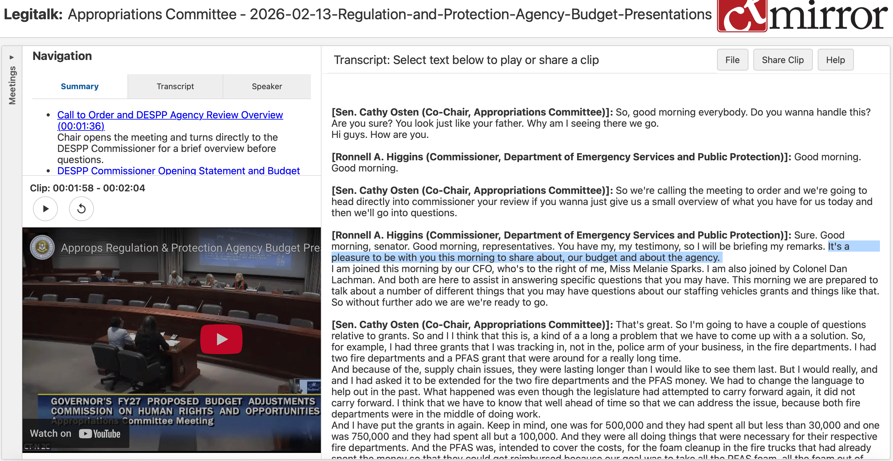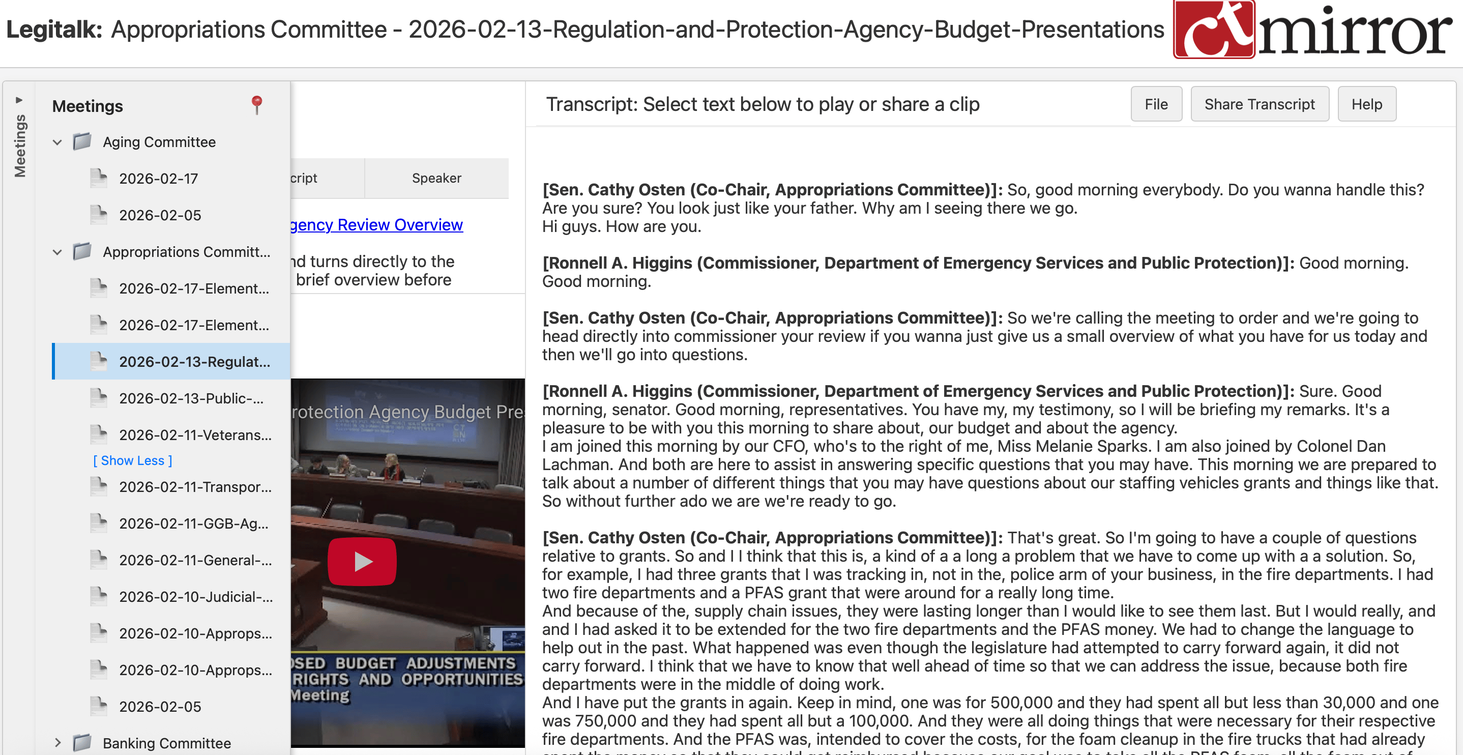 The tool that made this possible: Legitalk, a new AI-powered system that transcribes Connecticut legislative hearings, indexes them by bill number and speaker, and lets reporters jump directly to the moments that matter.
