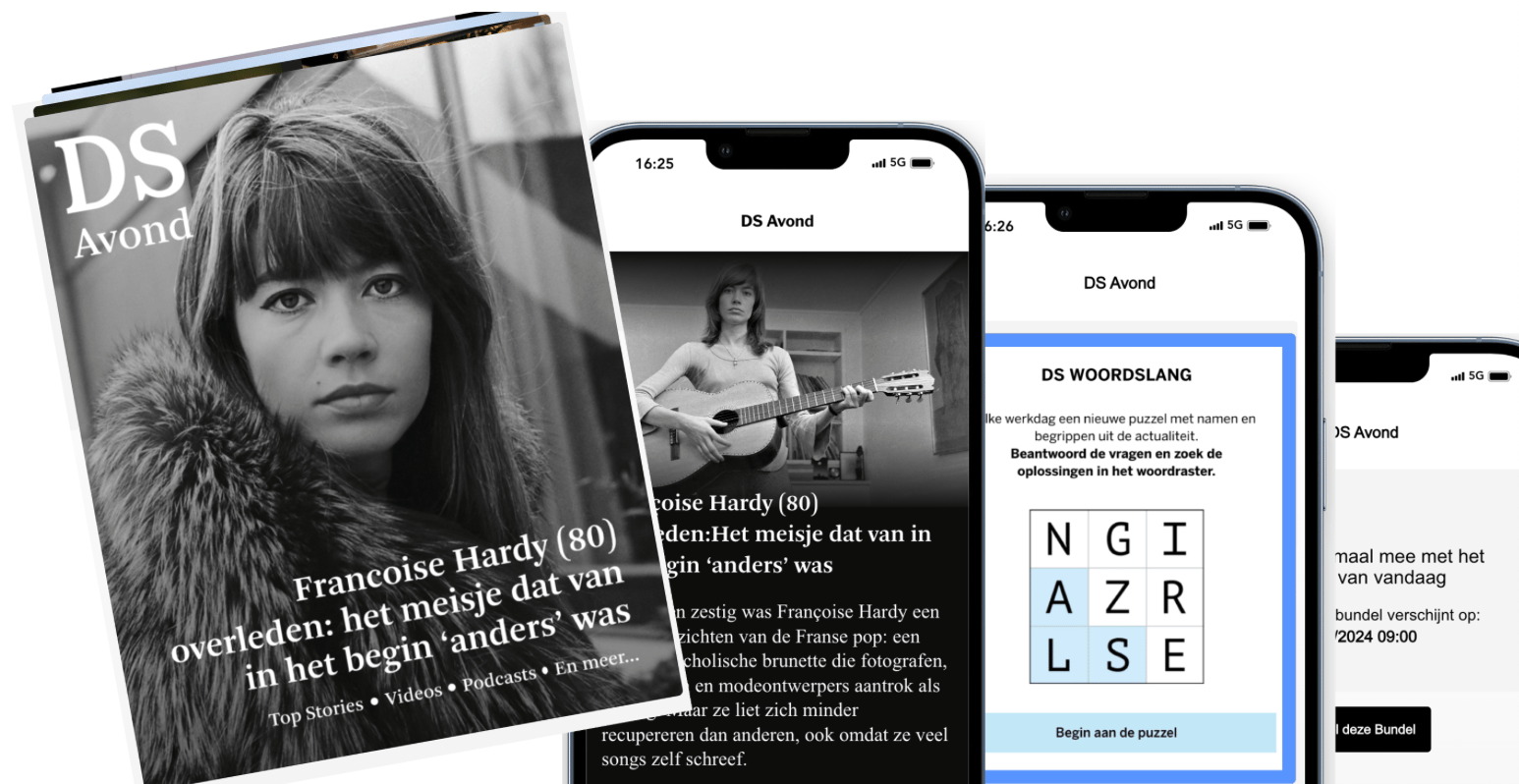 Left: A bundle with stacked cards for swiping. DS Avond is the digital-only evening edition of the Belgian newspaper De Standaard. Right: GerBen Van ‘t Hek wants to reach new audiences with repurposed content.